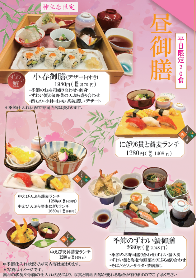 にぎりすし、刺身、うなぎ、天ぷら、そば、うどんなど、江戸前寿司と本格和食を日常に楽しめます!