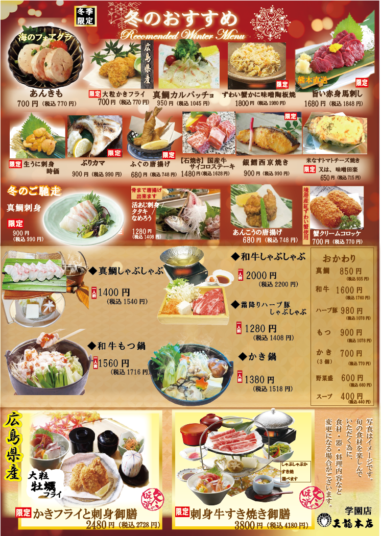 ご家族やご友人とのご会食、各種ご宴会に、天龍本店の冬の味覚をぜひご堪能ください。